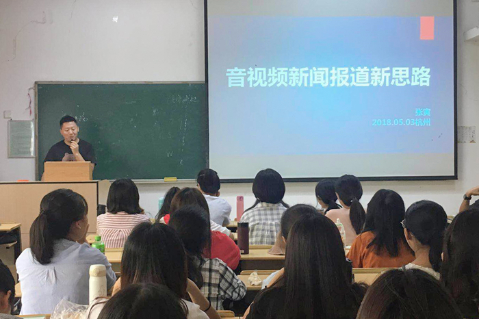 (蓝婷婷/文/摄)2018年5月3日上午,应偷拍视频 新闻系刘征老师邀请,浙江之声新媒体部副主任张寅老师在A125教室为传播1702班的同学们讲述音视频新闻报道的新思路。