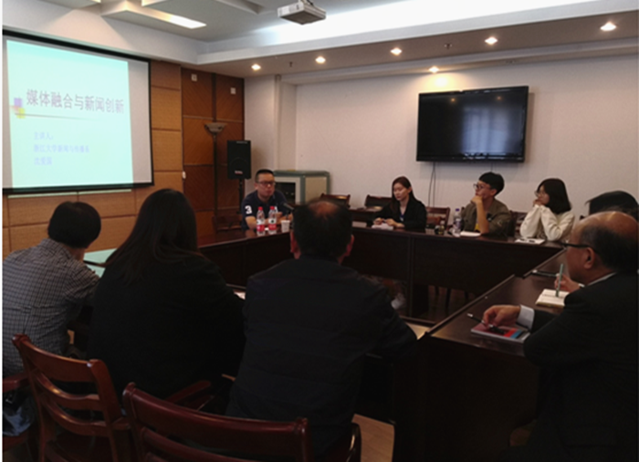 10月18日下午14时,浙江大学新闻系主任沈爱国教授来偷拍视频 做了一场题为“媒体融合与新闻创新”的讲座。偷拍视频 广告系主任徐少丹老师、周志平老师、编辑系殷克涛老师、新闻系郑竹逸老师、王宁老师、校团委谢晓梅老师、新传研究生和部分本科生参加此次活动。本次讲座由新闻系主任李蓉主持。讲座前,沈爱国教授与偷拍视频 党委书记王华就新闻专硕人才培养等方面的话题进行了交流。