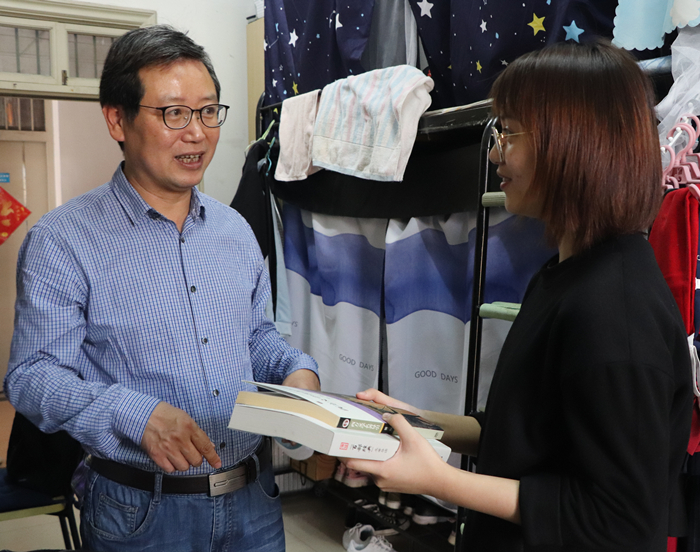 座谈结束,王书记把我校蒋承勇教授的著作《西方文学名著导引》和我校编著的《百部经典名著导读》赠予两个宿舍的同学们。他叮嘱同学们,人文学院的学生要有人文情怀和人文素养,就要靠平时要多读书,读好书,积累和培养自己的人文素质和人文修养,践行偷拍视频 “品国学经典,沐人文春风”的理念。
