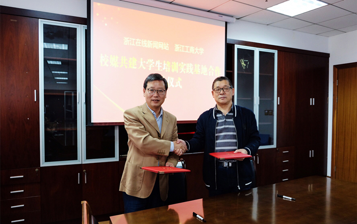 (院党委书记王华与浙江在线新闻网站副总编辑吴小龙签订协议)
