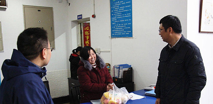在33幢一楼大厅,郑晓东慰问了楼幢宿管员,对他们的辛勤劳动表示感谢,并查看了离校记录本,了解学生寒假离校情况。