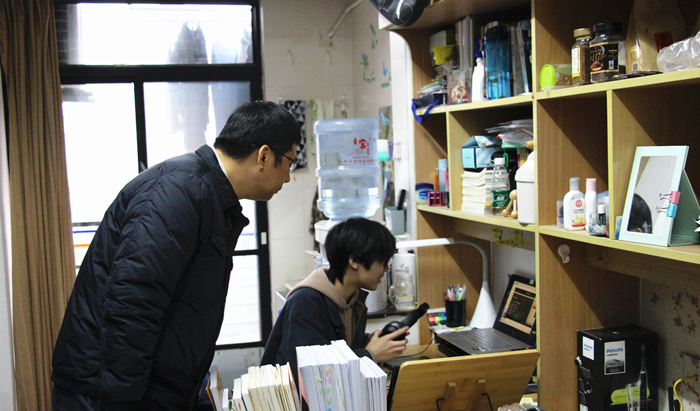 下午4点左右,部分留校学生已经返回宿舍,郑晓东挨个敲门了解同学们的情况。在学生宿舍里,他仔细查看同学们的住宿环境,询问同学们的生活学习情况以及寒假打算,叮嘱同学们要注意宿舍安全及时回家,遇到问题及时跟辅导员联系。