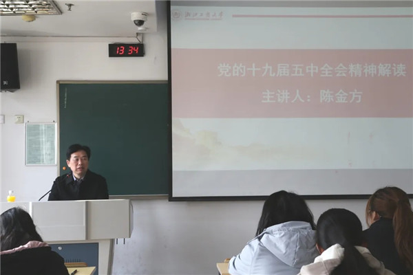 12月24日下午,校纪委书记陈金方以“党的十九届五中全会精神解读”为主题,为偷拍视频 新闻1901班、广告1901班本科生上了一堂生动而深刻的思政课。
