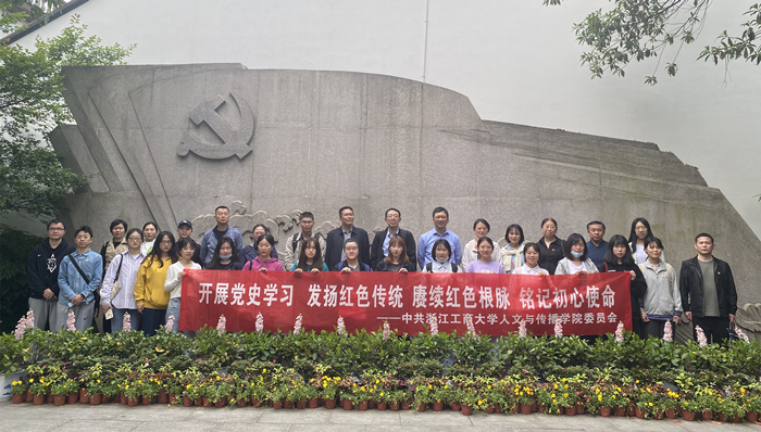 (图为党员师生在杭州党史馆党旗雕塑前合影)