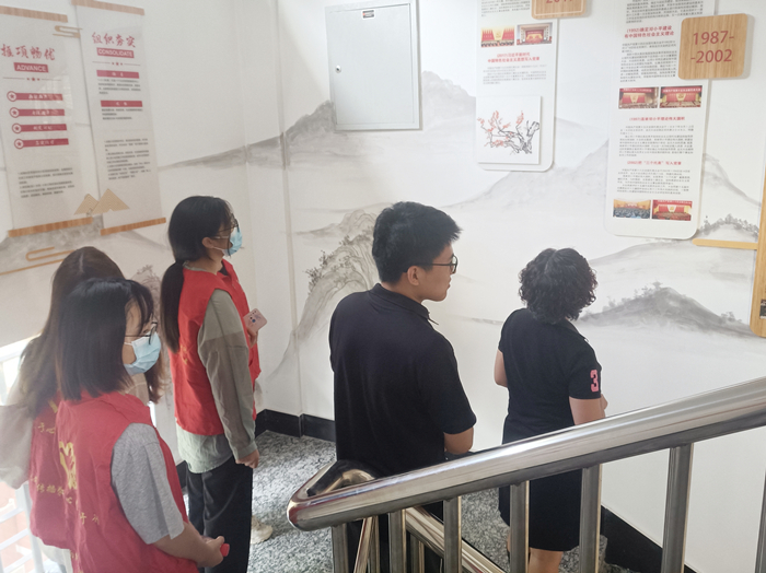 随后,黄凡带领同学们参观了在临平区红联社区建设的党史教育长廊,他带领同学们回顾了中国共产党百年光辉历程。同学们认真地观看每一幅历史图片、仔细地阅读着每一个动人故事,大家从中国共产党经历的一次次洗礼中了解到了我党所经历的气壮山河的奋斗历史。参观结束后,黄凡指出,中国共产党的宗旨全心全意为人民服务,同学们参加志愿服务也是为社会提供服务的表现。他希望同学们也能秉持服务的初心,在专业学习之余,通过阳光公益服务社在内的多个平台、多条途径投身志愿服务,在志愿服务中展现青春力量、奉献无私爱心、提高实践能力。