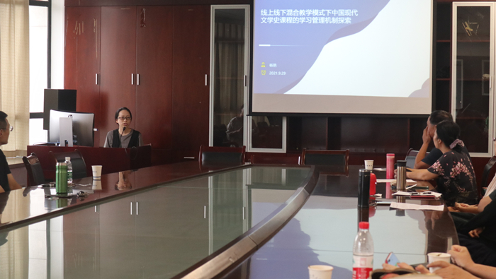 张亦辉老师主要谈了电影叙事教学改革 。陈军老师谈了“西方戏剧选读”与表演实践。李艳梅老师分享了“外国女作家作品研究”。李裕政老师主要讲了“学诗以立——大学语文课程之中国古代诗歌” 。唐妍老师提出了“直播+翻转”背景下《中国文化概论》。杨艳老师主要讲述了“线上线下混合教学模式下中国现代文学史课程” 。中文系渠晓云老师主要分享了《庄子》与人生课程。李玲玲老师提出“中国古代文学史”以研究带动教学的实践 。陈伟老师分享了线上线下混合教学模式下现代汉语课程的学习。王丽梅老师主要谈了古诗文吟诵与《中国古代文学史》教学改革。