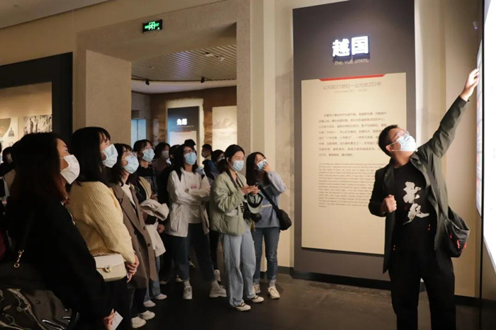 绍兴博物馆分“先越、越国、会稽郡、越州、绍兴府、近代绍兴”六个部分,系统展示了从旧石器时代到新中国成立的绍兴历史文化,以新石器时代的钺,商周至春秋战国的印纹陶、原始瓷、越王剑,汉代至唐代的越窑青釉瓷、会稽铜镜,明清时期的书画作品为特色。陈导为同学们讲解了部分展品,并介绍了相关历史。据考证,晚更新世(约126000年-10000年)以来,在当时的中国东部沿海曾发生过三次大海进和海退,而全新世之初(约12000年)开始的第三次海进对宁绍平原影响最大。距今7000-6000年,海进达到高峰,海水直逼会稽山北麓,越地历史传说中的大禹治水就发生在此时,此外还有越民筑塘治水一说。