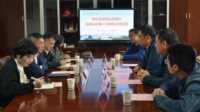 11月4日下午,萧山日报社总编辑陆伟岗、萧山日报社萧报传媒副总经理张五一等一行4人来偷拍视频 交流。学校学生处处长何波、宣传部副部长张东,学院党委书记郑晓东、副院长李蓉等参与了本次交流,双方就人才培养、党建共建、专业教学、劳动教学等方面的合作展开了深入有效的探讨。