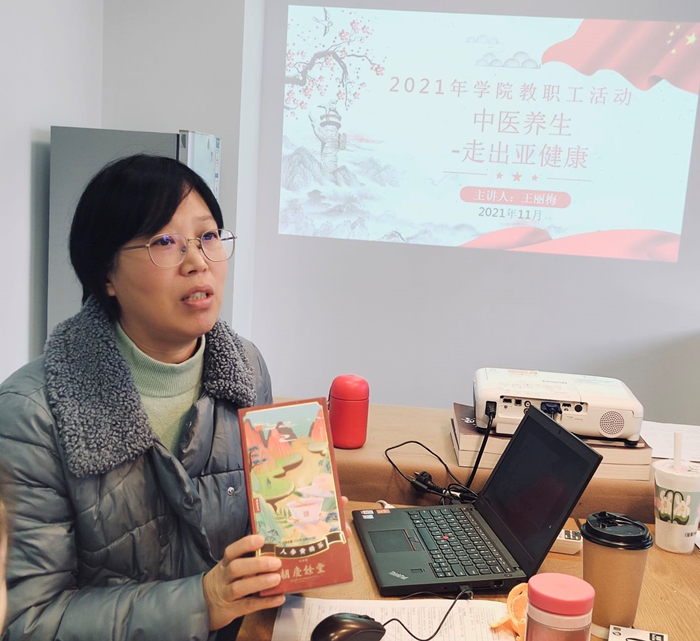 活动开始,王丽梅老师先发放中医体质自测表,根据自测表结果来引入对中医“九大体质”的介绍,为大家深入浅出地讲解了九大体质的具体特征以及相应的调理方法。同时,王丽梅老师结合她多年以来的中医养生健身经验,与大家分享了中医养生的重要性以及特色中医养生方法等,到场的各位老师都表示受益匪浅。