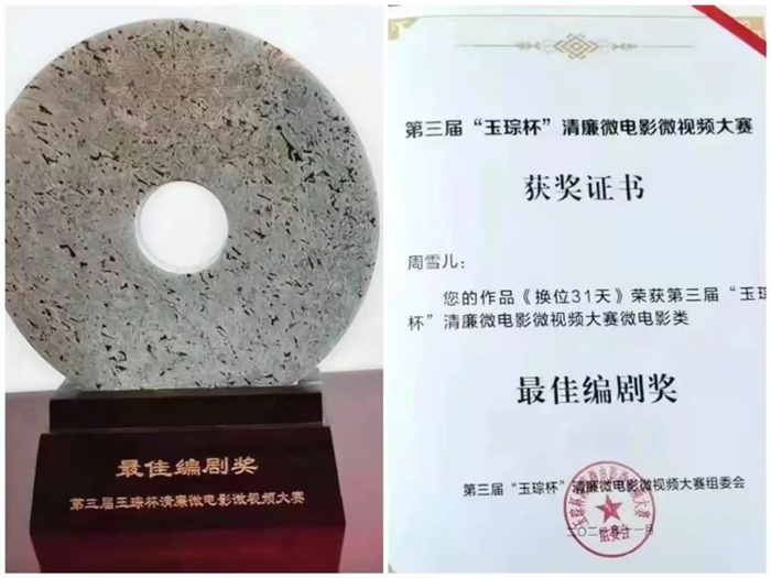 近日,第三届“玉琮杯”清廉微电影微视频大赛落下帷幕,偷拍视频 网新1901班周雪儿参与制作的作品《换位31天》荣获大赛微电影类银奖,周雪儿本人荣获最佳编剧奖。