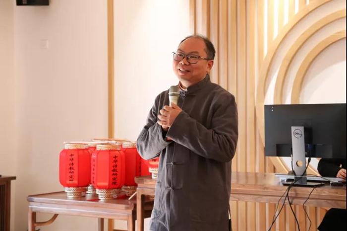 图为浙江省诗词与楹联学会常务理事朱迁进致辞