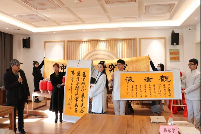 揭牌仪式后,杭州商学院图书馆馆长、黄宾虹画院院长韩永学,代表王羲之艺术研究院和黄宾虹画院向中华诗教研究院捐赠三幅书画作品,祝贺中华诗教研究院的成立。其中一幅书法作品写有北宋大家张载的“为天地立心,为生民立命,为往圣继绝学,为万世开太平”,表达了他对中华诗教研究院传承与创新诗教实践的美好期许。