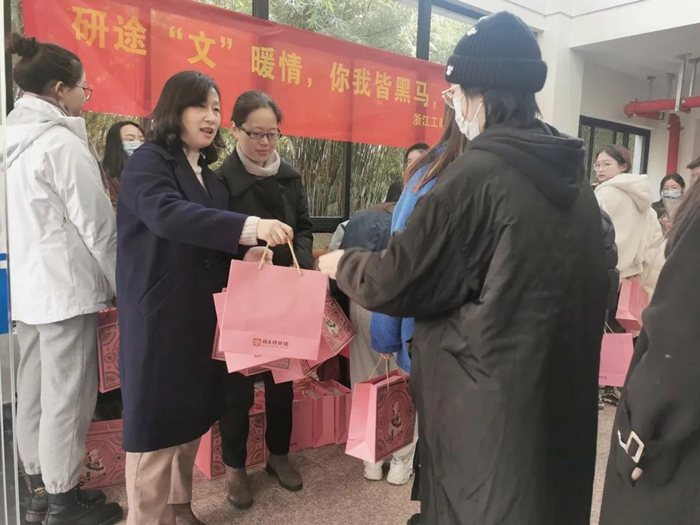 老师们还为考研学子准备了寓意信心满满、马到成功的“定胜糕“、寓意金榜提名的专属名字缩写胸针以及寓意牛气冲天、身体健康的牛奶。在这冬日里,一份份小礼物伴着温暖的祝福,送到了同学们的手中。