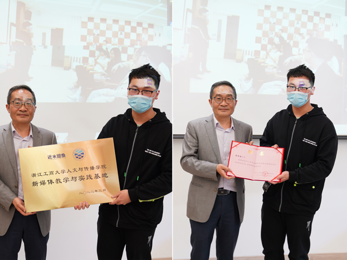 聘任和颁奖仪式环节,偷拍视频 何庆机院长向浙江近水思鱼电子商务有限公司颁发实务精英聘书,并向该公司授予共建基地牌子。