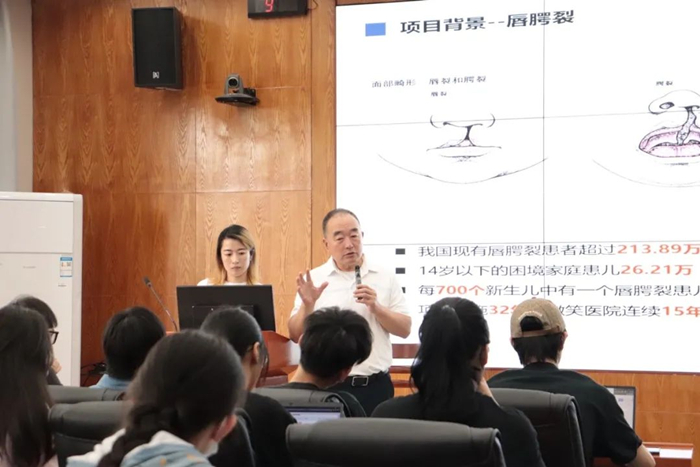 图为韩凯医生在给同学们介绍唇腭裂的科普知识