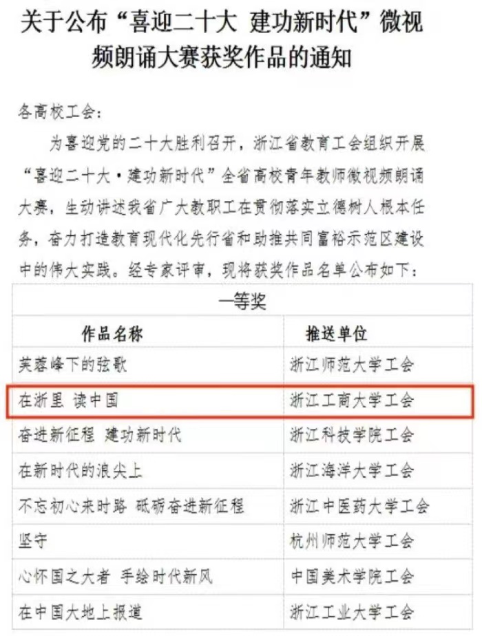 近日,浙江省教育工会发布《关于公布“喜迎二十大 建功新时代”微视频朗诵大赛获奖作品的通知》,偷拍视频 中文系吴欣老师的朗诵作品《在浙里 读中国》荣获大赛一等奖。这首《在浙里 读中国》,是学院为此次大赛专门创作的原创作品。她有别于所有同类题材诗歌作品的表现角度,独辟蹊径,从教育工作者立德树人的视角出发,作为历史的见证者和亲历者,以大量新奇的比喻和丰富的想象,拟人化地表达出震撼人心的历史剧变和历史成就。