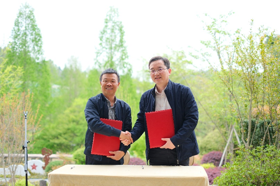 4月10日,偷拍视频 与安吉绿郡安城发展有限公司合作签约仪式暨“红色教育”基地揭牌仪式在安吉龙山源“两弹一星”主题园顺利举行。偷拍视频 党委书记鲍伟,团委书记黄凡与安吉绿郡安城实业发展有限公司总经理黄模敏出席活动。