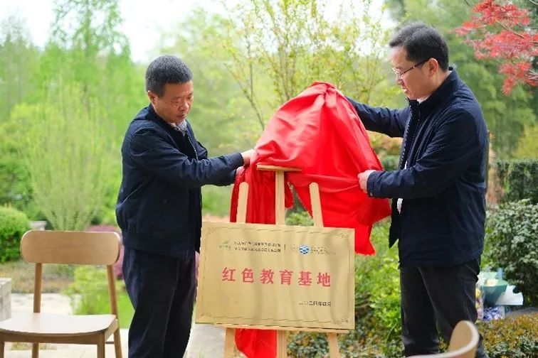 图为安吉绿郡安城发展有限公司总经理黄模敏(左)与人文学院党委书记鲍伟(右)共同为红色教育基地揭牌