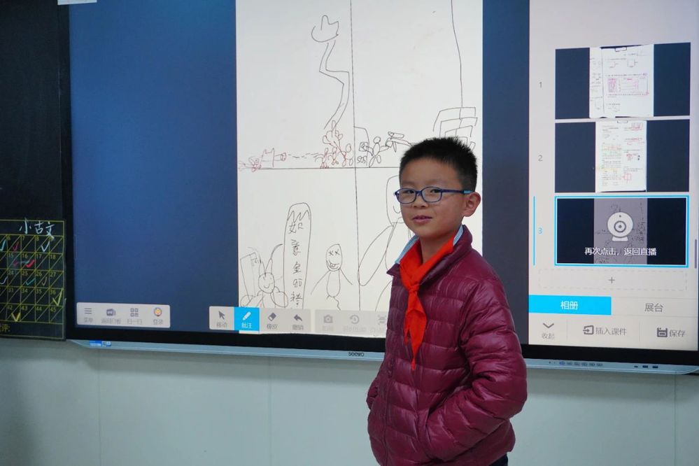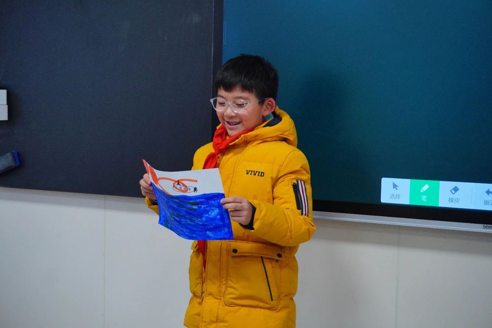 在每组小朋友们都画上了自己的想法之后,他们按照顺序上台介绍自己的所画的部分。尽管只是三年级的孩子,但小朋友们丝毫没有怯场,而是开朗大方的向其他小朋友们讲述自己的想法。在每组的最后一位小朋友的“接力”完成之后,呈现出来的