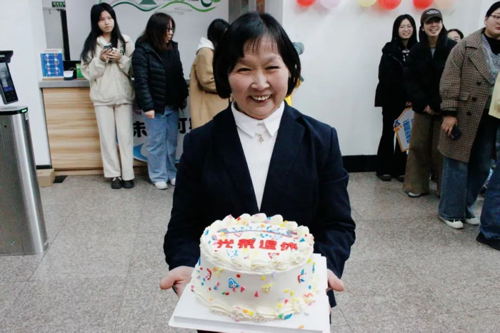 当张阿姨提着外卖走进大厅时,惊喜又了然的笑脸在她脸上漾开。人文学院的师生们先后给张阿姨献上了鲜花和礼物,接着,张阿姨切开蛋糕分给了在场的所有人。面对“阿姨来说几句”的提议,张阿姨抱着花腼腆地笑着,说:“我不善言辞,也从没想过同学们都会一起来欢送我退休,但我今天真的很开心。”说着,张阿姨的声音里染上了些哽咽。最后,张阿姨和大家一起留下了一张大合照,这场欢送会也在《送别》与欢笑声中悄悄走向尾声。